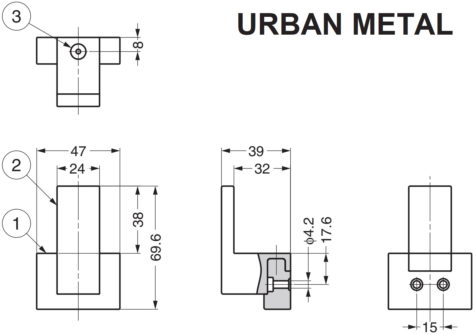 - De PXB-UM05-101-BL design haken hebben twee montagegaten met een diameter van ⌀4,2 mm (11/64″), met verzinking