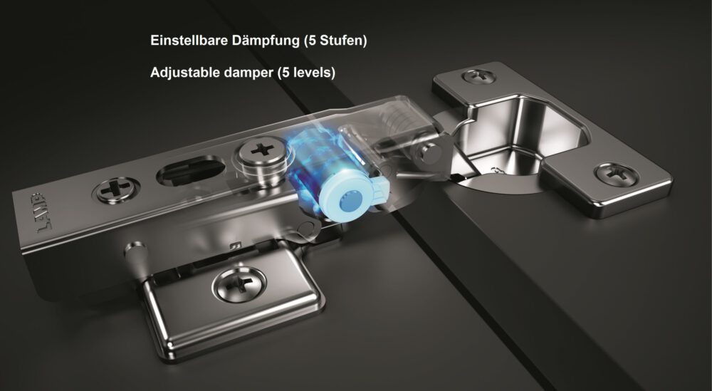 - Instelbare demping geïntegreerd in de scharnierarm: gereedschapsloos, 5 niveaus