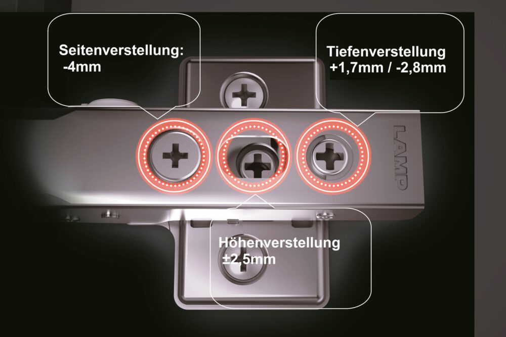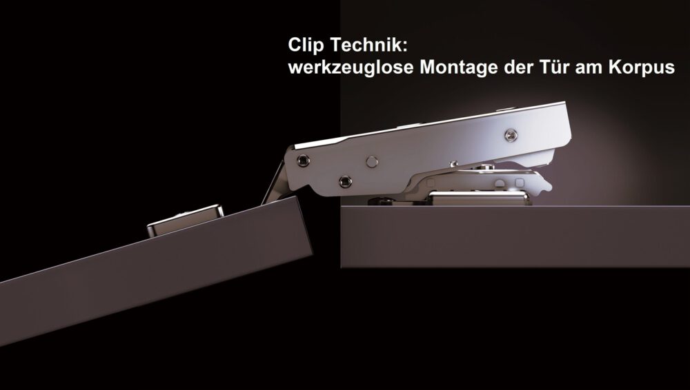 Een andere innovatie is de bevestiging van de montageplaat. In tegenstelling tot conventionele potscharnieren, die van voor naar achter moeten worden gemonteerd, kan Olympia worden gemonteerd door eenvoudigweg van bovenaf te duwen. Dit bespaart niet alleen tijd bij de montage, maar ook zenuwen wanneer drie of meer scharnieren moeten worden geïnstalleerd. Elk scharnier kan gemakkelijk na elkaar worden vastgeklikt.