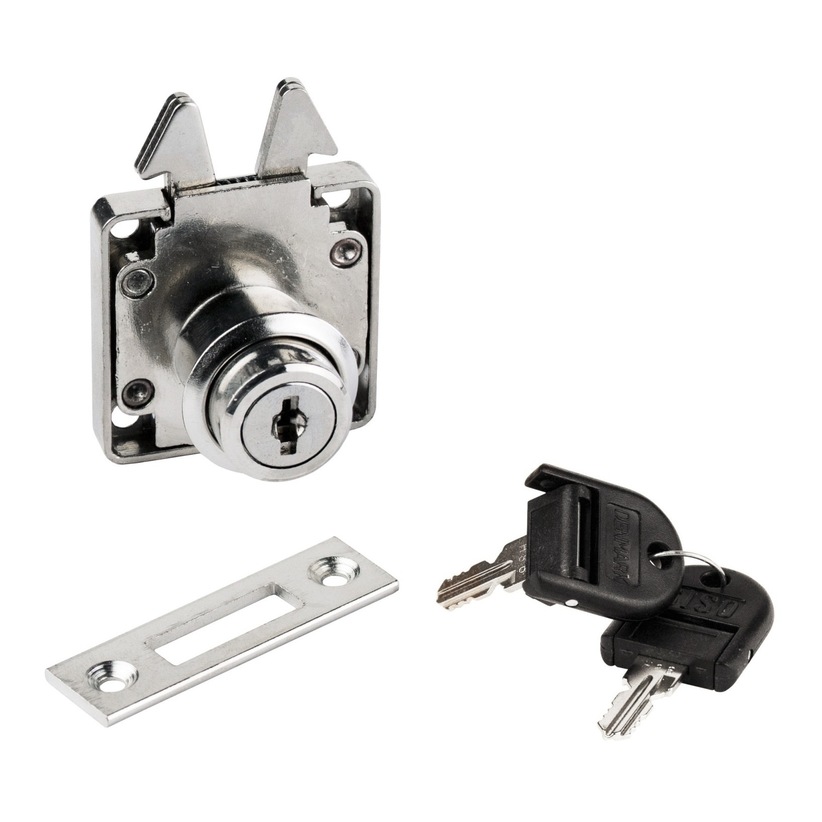 Hoogwaardig rolluikslot met haak 14.01.464-0, met mogelijkheid tot gebruik van hoofdsleutel J12, met cilinderrozet en twee inklapbare sleutels, incl. sluitplaat, gemaakt van robuust staal, oppervlak: vernikkeld