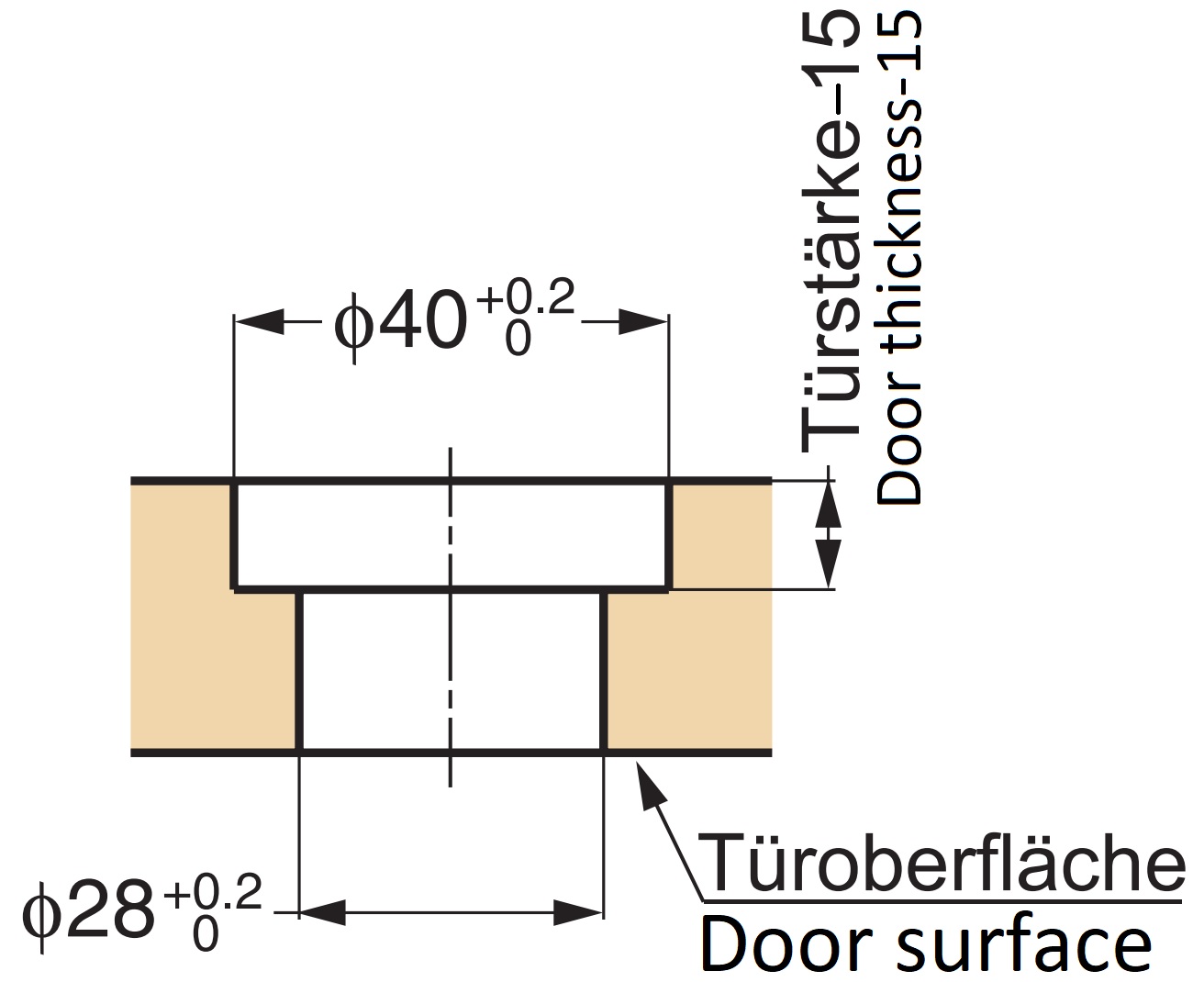 - Voor de installatie moet aan de voorkant een gat met een diameter van ⌀28 mm (1-7/64″) worden geboord