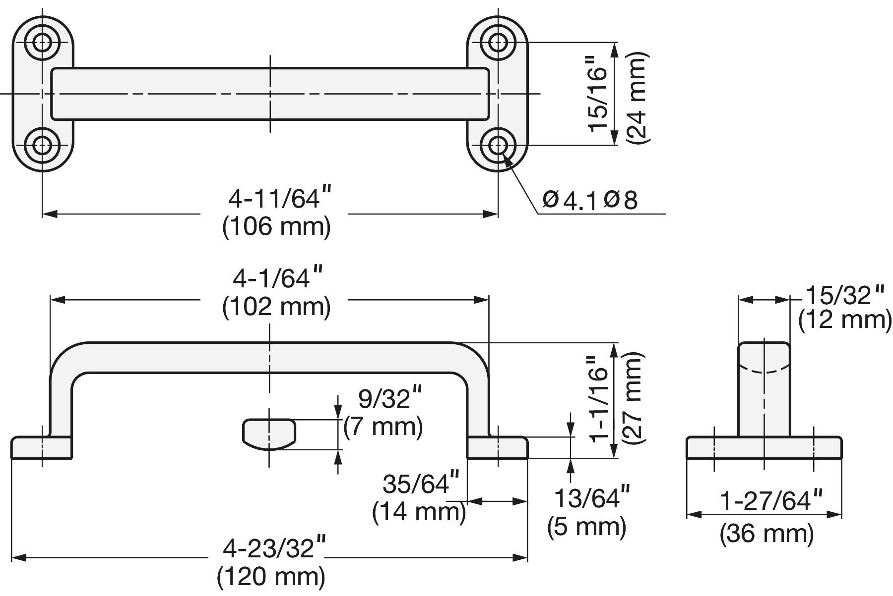 - Totale breedte van de roestvrijstalen handgreep: 120 mm (4-23/32″)