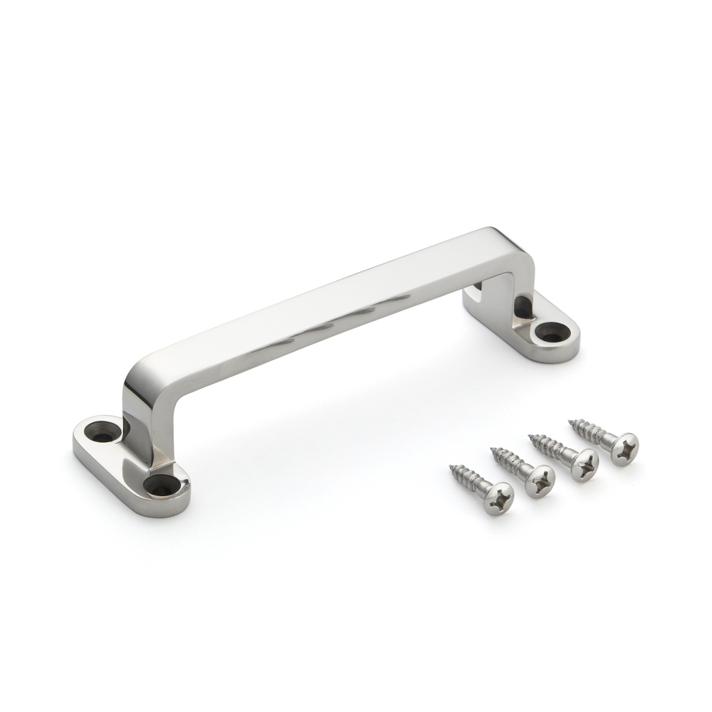 Roestvrijstalen handgreep V2A (SUS304), 150 mm (6″) FT-150. Hoogwaardige massief roestvrijstalen handgreep van roestvrij staal V2A (SUS304), spiegelgepolijst met vier montagegaten, voor schepen, boten, jachten, roestvrijstalen keukens van Sugatsune / LAMP® (Japan)