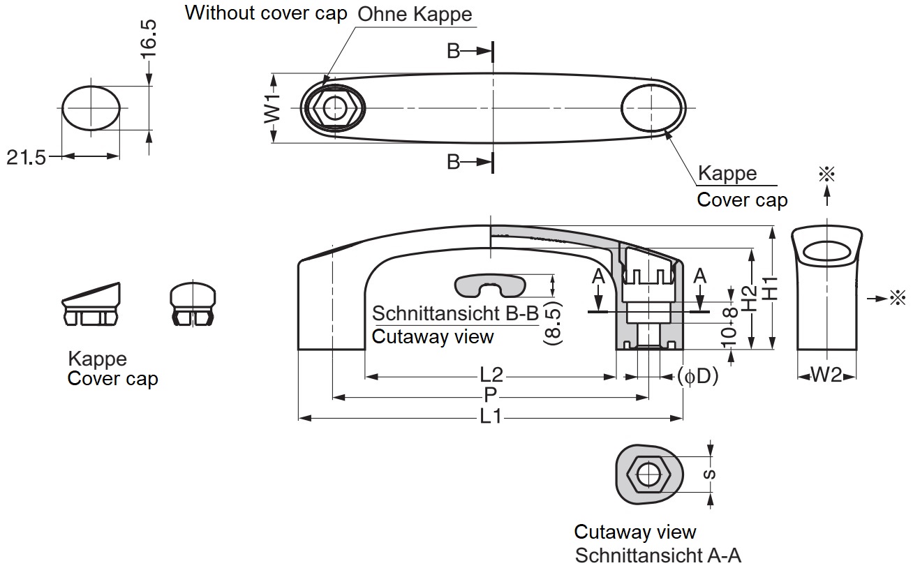 De plaatsen waar het draagvermogen van de handgreep in twee richtingen wordt toegepast, worden op de technische tekening gemarkeerd met het teken “※”.